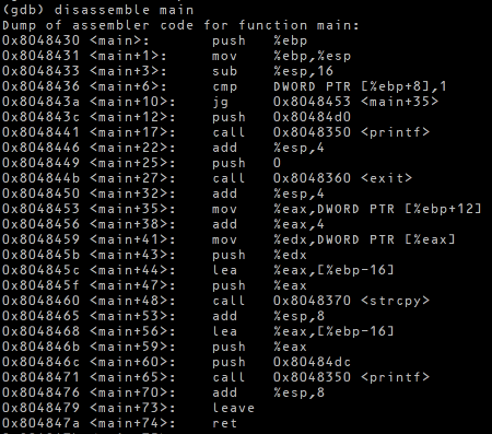 - strcpy 함수 인자로 ebp-16 을 넣음 ( = ebp-0x10)
