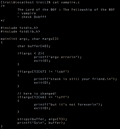 스택의 주소를 이용해야 하지만, 0xbfffXXXX 주소를 이용해서는 안 된다. 스택의 주소를 낮추어 2번째 바이트가 0xff가 아니도록 하면 되겠다. argv 개수의 제한은 없고, 또한 길이 제한도 없으므로 main함수 인자를 길게 넣어 스택 주소를 조정하면 되겠다.