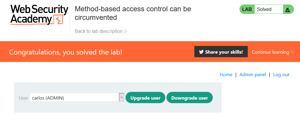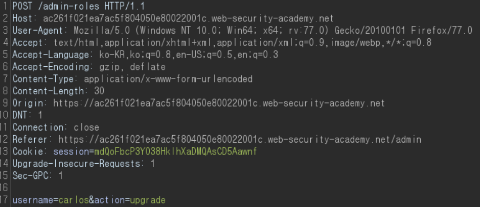이 문제에서는 부분적으로 HTTP 요청 메소드를 기반으로 액세스 컨트롤을 한다. administrator:admin 계정을 제공하며 이를 이용해 admin 페이지에 접근할 수 있다. 문제를 풀려면 wiener:peter 계정으로 로그인한 뒤, 결함이 있는 액세스 제어를 이용하여 관리자로 권한을 상승해야 한다.