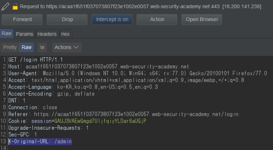 로그인 버튼을 눌러 패킷을 생성하고, X-Original-URL 헤더에 /admin을 입력한다.