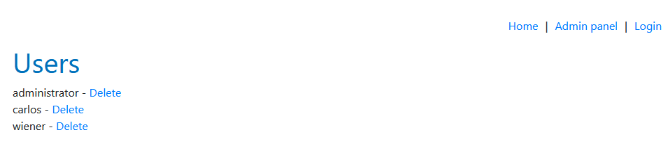 admin 페이지에 /admin 경로로 접속할 수 있다. 하지만 프론트엔드 시스템이 해당 경로에 대한 외부 액세스를 차단하도록 구성되어있다. 하지만 백엔드 어플리케이션은 X-Original-URL 헤더를 지원하는 프레임워크 위에 만들어졌다. admin 페이지에 접근하여 carlos를 삭제하라.