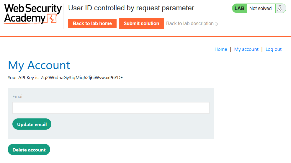 wiener로 로그인하여 My Account 페이지에 가면 API key를 볼 수 있다. 이 때 접속한 경로는 /my-account?id=wiener 이다.
