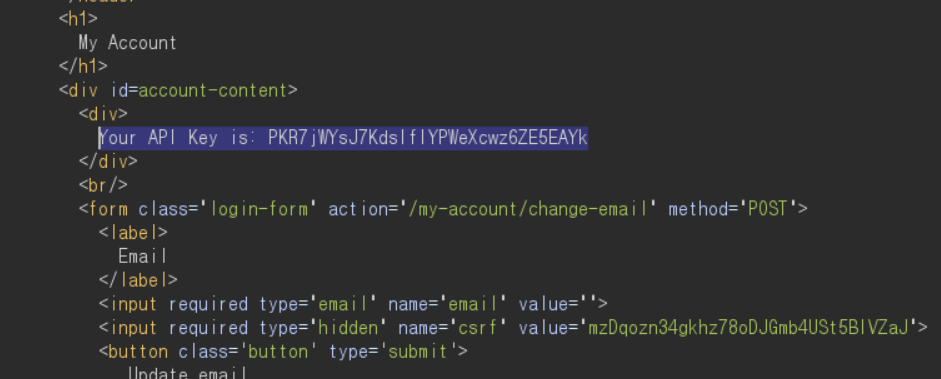 wiener로 로그인하여 My Account 페이지를 열면 API Key가 보인다. 이 페이지는 /my-account?id=wiener 경로로 접근한다. id를 carlos로 변경하면 메인 페이지로 이동한다.