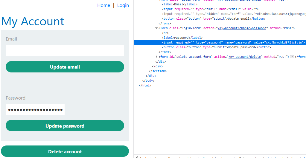 wiener 계정으로 로그인하여 My Account 페이지에 접속하면 비밀번호를 재설정하는 폼이 있고, 마스킹된 비밀번호가 써있다.