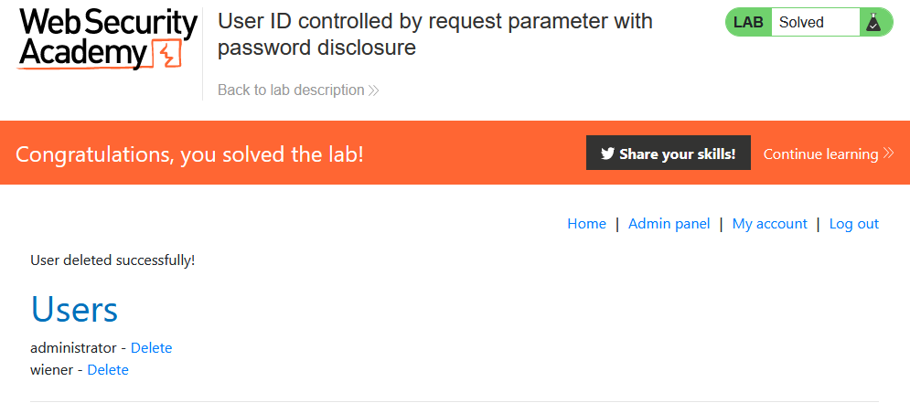 Account Details 페이지에서 암호에 대한 정보를 얻을 수 있다. 이를 이용하여 administrator로 로그인, carlos를 삭제하라. wiener:peter 계정을 제공한다.