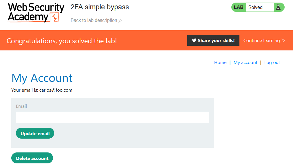 wiener:peter 계정을 이용해 로그인할 수 있다. carlos:montoya 계정으로 접속할 수 있는데, 2FA를 통과해야 한다. Carlos의 “My account” 페이지에 접속해야 한다.