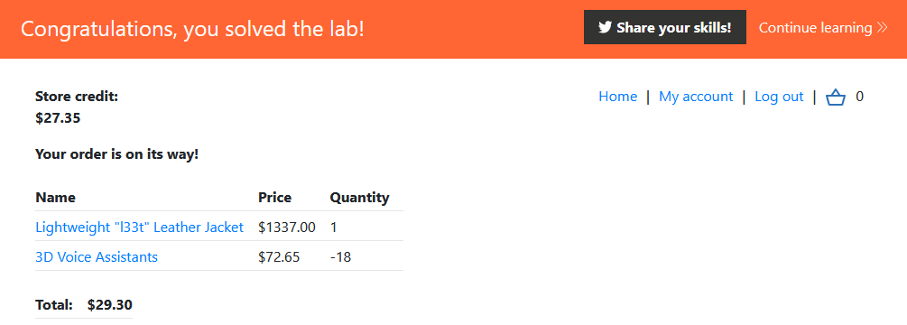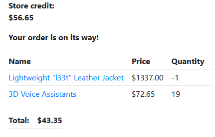 사고싶은 아이템 수를 양수로 두고 다른 아이템을 추가해 가격을 맞추니 성공했다. 이 취약점은 물건 수를 음수로 설정할 수 있고(클라이언트 스크립트에서만 검증한다.), 전체 가격만 validation 체크를 한다는 점 때문에 발생했다.