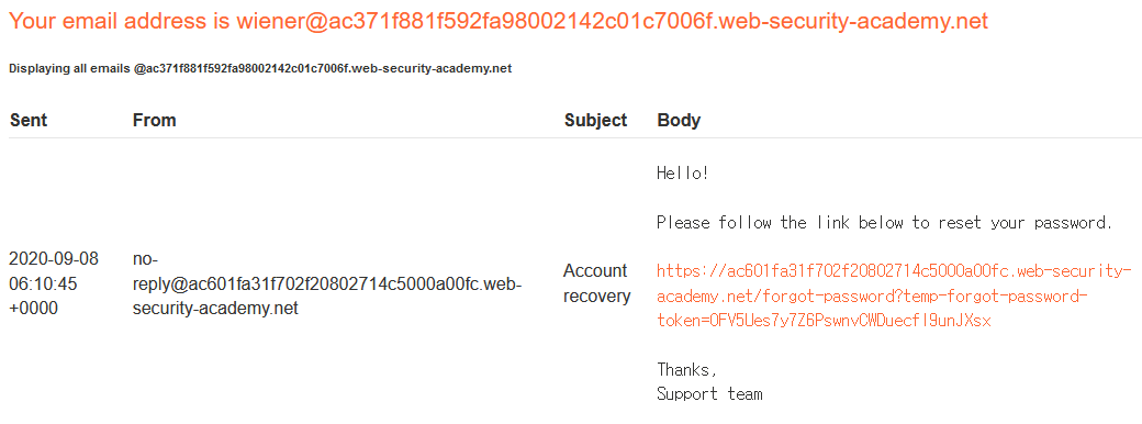 공격자가 소유한 wiener를 입력하면 등록되어 있는 이메일로 리셋 토큰이 포함된 URL이 전송된다. 접속하면 새로 설정할 패스워드와 이를 다시 한 번 확인하는 폼이 나온다.