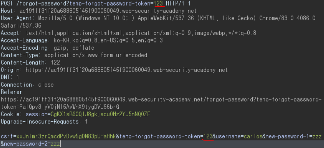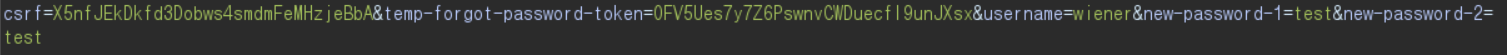폼에 입력한 뒤 제출을 누르면 토큰, 유저 이름, 새로운 패스워드가 포함된 패킷이 간다. 여기서 유저 이름을 victim인 carlos로 조작한다.