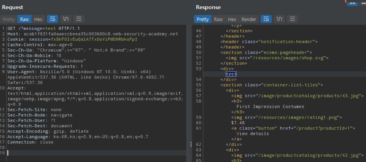 이 입력값이 서버에서 반영되는 것인지, 클라이언트에서 반영되는 것인지 판단해야 한다. 이를 판단하기 위해 HTTP response를 잡아본다. test라는 문구가 HTTP response로 올 때부터 반영이 되었다는 것을 볼 수 있다. 따라서 이 입력값은 서버사이드에서 반영된 것이라 판단할 수 있다.