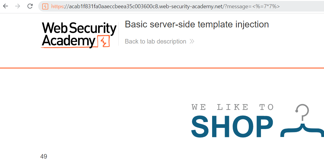 <%=7*7%> 페이로드를 넣어 7*7의 결과가 표시되었다. 이는 서버사이드에서 이 연산을 실행한 후 결과를 반사해 HTML에 넣어 보낸다는 것을 의미한다. 이로써 SSTI 취약점이 있다는 것을 확인했다.