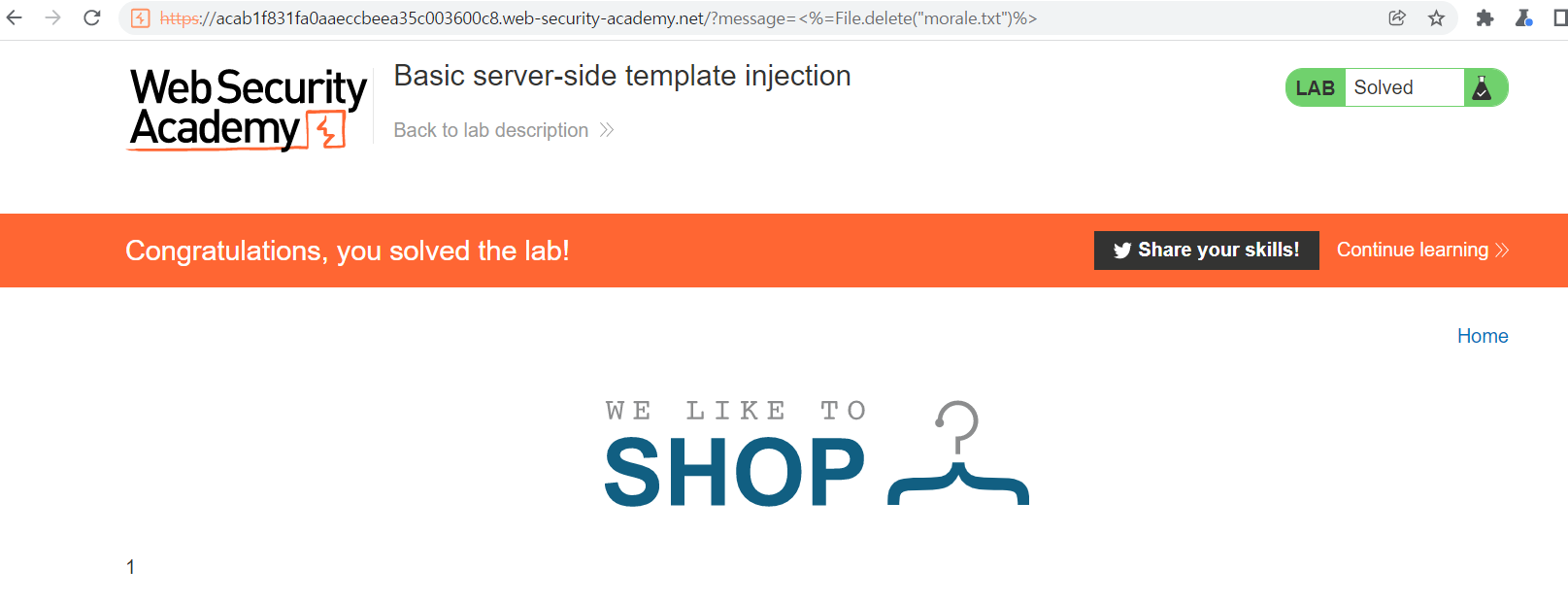 문제의 목표인 morale.txt 파일을 삭제하기 위한 페이로드를 생성해 보낸다. ruby 언어로 파일 삭제 코드를 써 <%=File.delete("morale.txt")%> 페이로드를 보내면 성공한다.