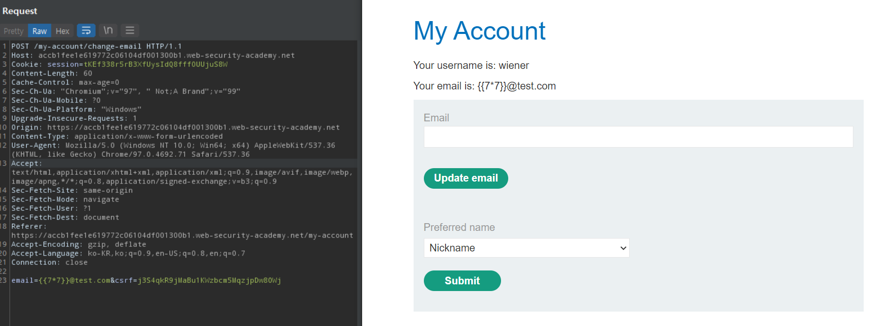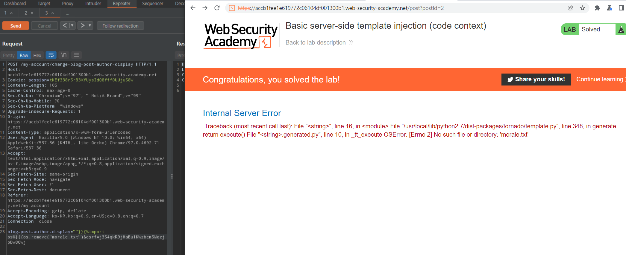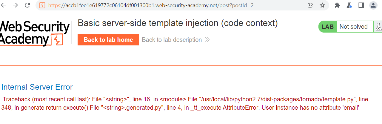 Tornado template을 사용하는데, SSTI 취약점이 있다. 이를 이용해 임의 코드를 실행하여 Carlos의 홈 디렉토리에 있는 morale.txt 파일을 삭제해야 한다. wiener:peter 계정이 주어진다.
