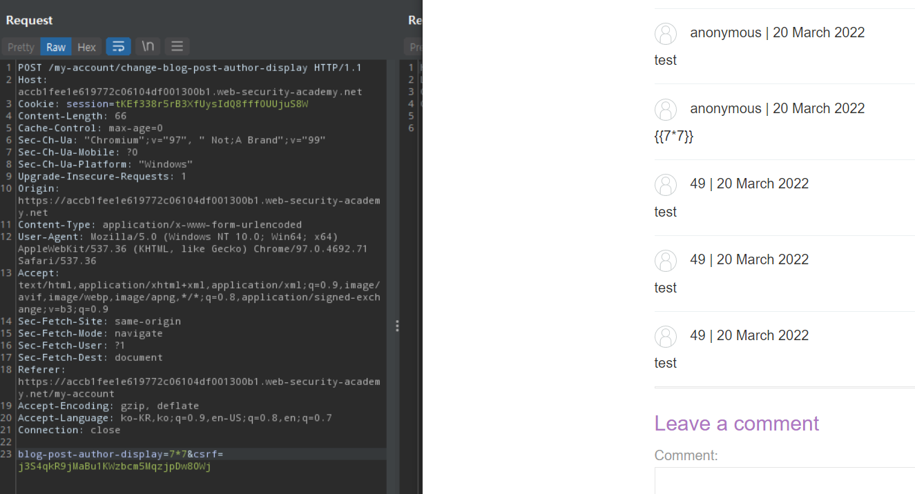 그런데, 입력한 변수의 이름을 그대로 템플릿에 반영한다면, 변수 이름에 템플릿 인젝션을 할 수는 없는걸까? 그래서 이번엔 user.name 대신 7*7을 입력했고, 이름 대신 49가 떴다. 템플릿에 7*7이 그대로 반사되어 실행이 된 것이다. 이제 SSTI 취약점이 존재한다는 것을 확인했다.