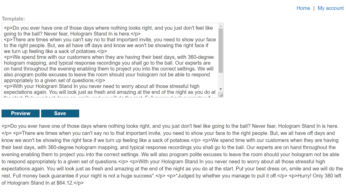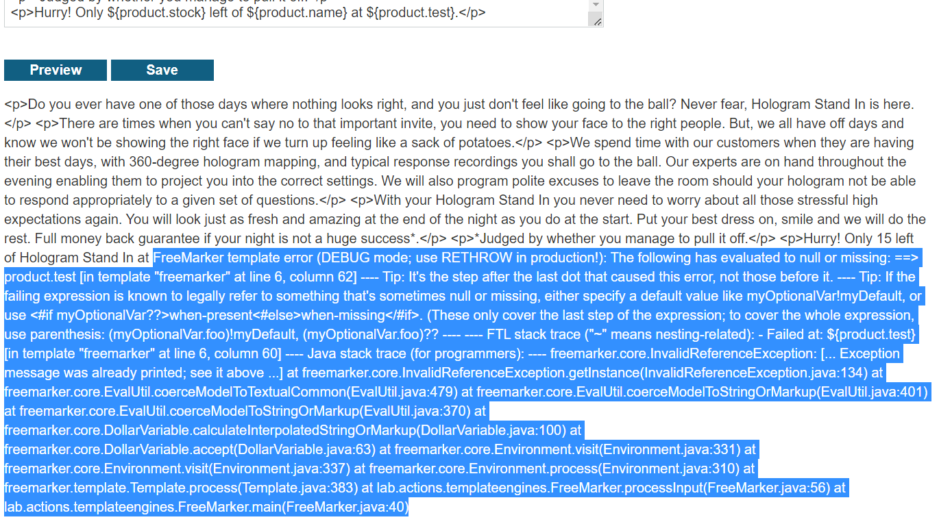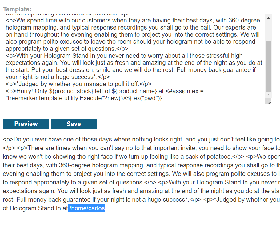 SSTI 취약점이 있다. 템플릿 엔진을 알아내고 Carlos 홈 디렉토리의 morale.txt 파일을 삭제해야 한다. content-manager:C0nt3ntM4n4g3r 계정으로 로그인할 수 있다.