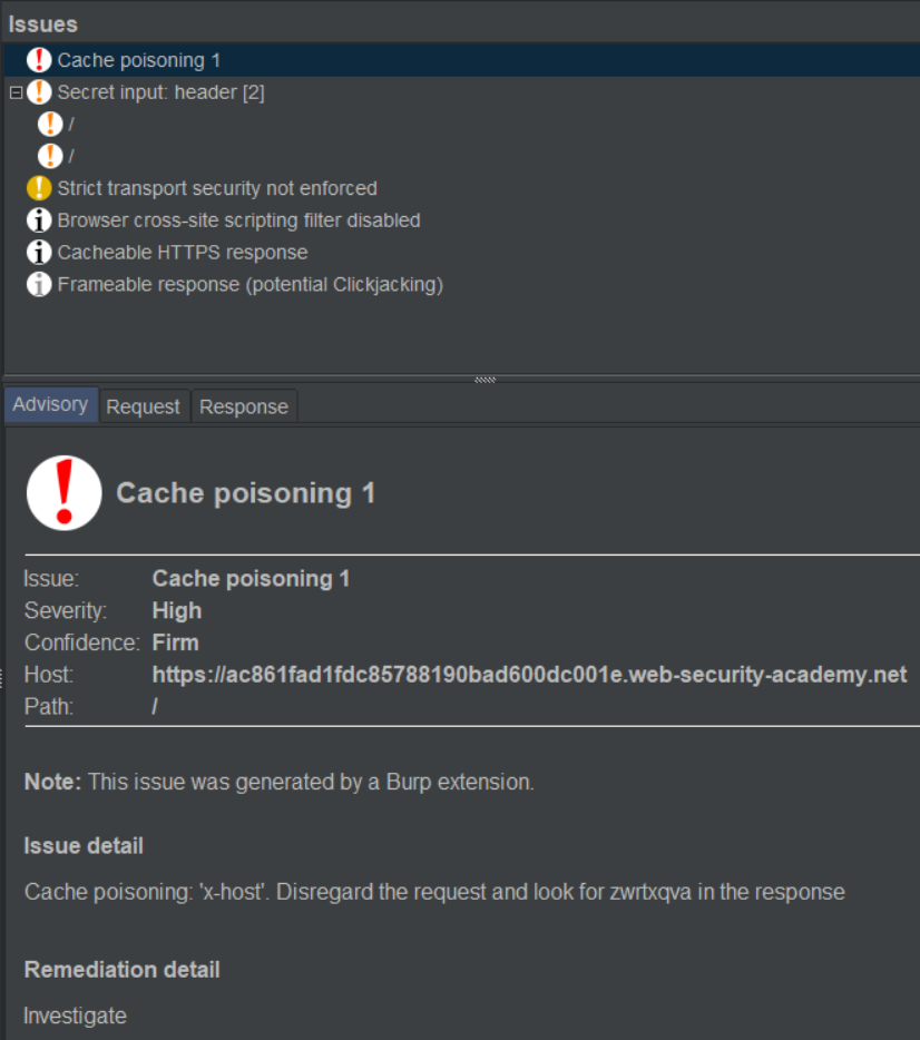 먼저 조작 가능한 unkeyed input을 찾아보았다. Param Miner를 이용해 숨겨진 헤더를 찾아보았다. x-host 라는 헤더를 찾아내었으며 이 헤더가 캐시 포이즈닝 공격에 취약하다는 것을 알아내었다.