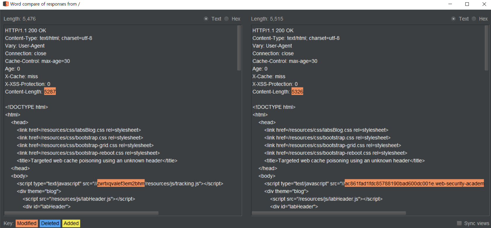 이와 같이 페이로드를 주입하여 보냈다. 하지만 캐시 페이지에 접근하지 못했다. 이는 Param Miner의 Request를 Repeater에 가져와 사용했는데, Param Miner가 다른 헤더에도 캐시 버스터를 넣었기 때문이다.