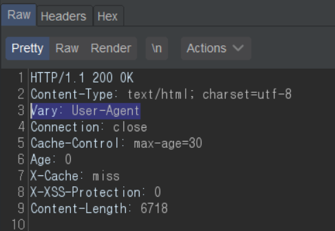 Response를 잡아보면 Vary 헤더의 값으로 User-Agent가 있다. Vary 헤더는 주로 unkeyed 헤더 중 key로 사용할 헤더를 지정하는 용도로 사용된다고 한다. 즉, Param Miner가 User-Agent에 포함한 캐시 버스터때문에 이 캐시에 hit되지 않은 것이다.