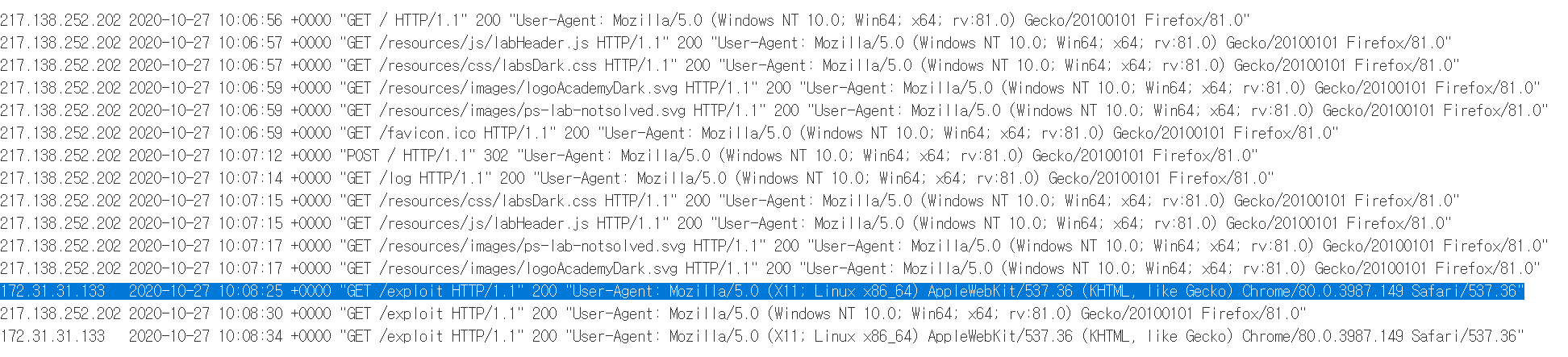 공격자 서버의 로그를 통해 타겟의 IP 주소와 User-Agent 헤더를 알아내었다. “Mozilla/5.0 (X11; Linux x86_64) AppleWebKit/537.36 (KHTML, like Gecko) Chrome/80.0.3987.149 Safari/537.36” 이다.