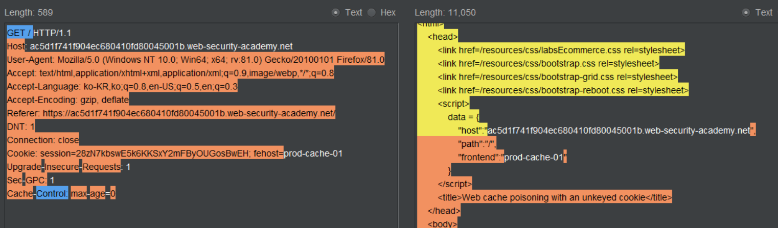 fehost라는 쿠키에 prod-cache-01 라는 값이 설정된다. 이는 Response에서 다음과 같은 내용으로 반사된다. 프론트의 캐시 서버나 설정 등을 의미하는 것 같다. Comparer를 이용하여 비교하면 편하다.