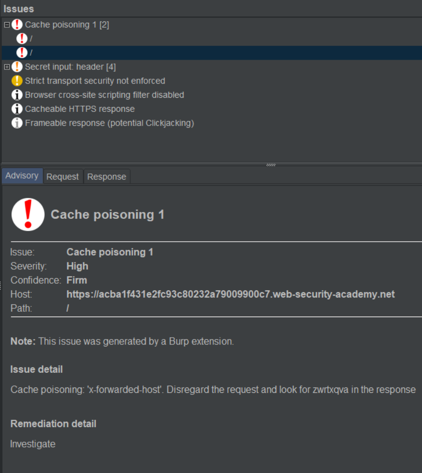 그리고 Cache poisoning이 가능한 헤더도 알려준다. 원래 Request에는 보내지 않던 x-forwarded-host 헤더에 zwrtxqva 라는 임의의 값을 넣고 테스트했는데 이것이 반사된다는 것을 찾았다.
