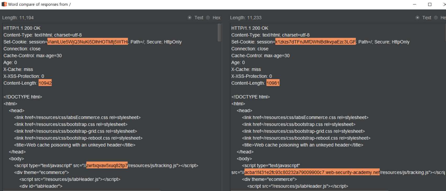 Secret input 알림에서 Compare Responses를 누르면 헤더를 바꿨을 때 다르게 응답한 것을 비교할 수 있다. x-forwarded-host의 값이 자바스크립트 링크 URL을 동적으로 생성하는 데 사용되었다.