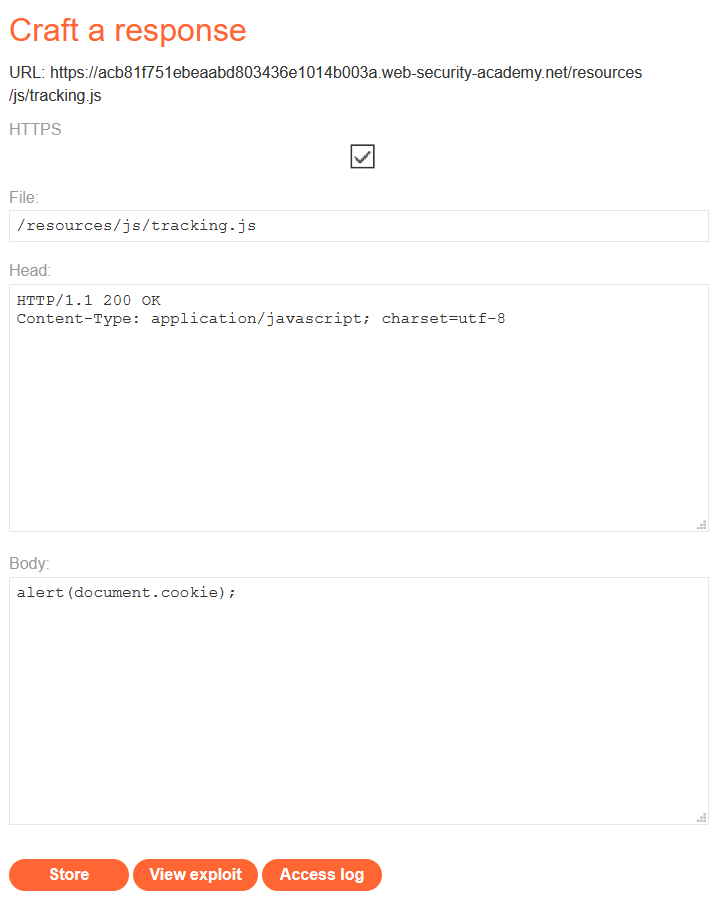 문제 상단의 Go to exploit server를 클릭하면 웹서버 반응을 만들 수 있다. x-forwarded-host값/resources/js/tracking.js 경로로 URL을 생성하므로, /resources/js/tracking.js 경로에 접근했을 때 실행할 자바스크립트 코드를 지정한다.