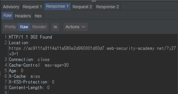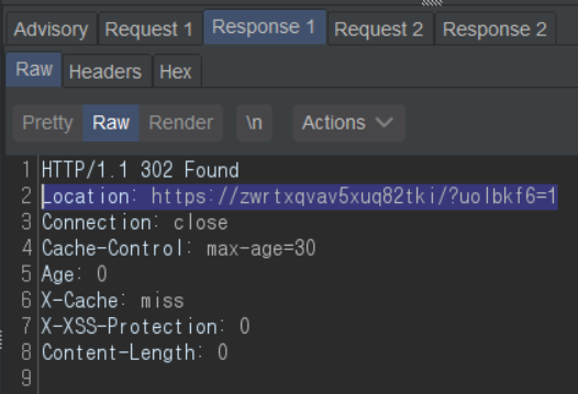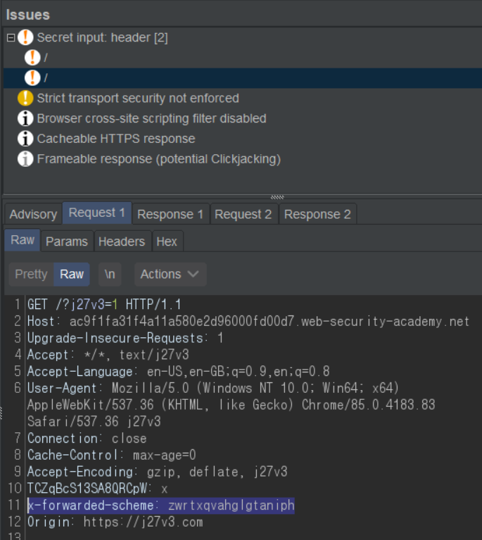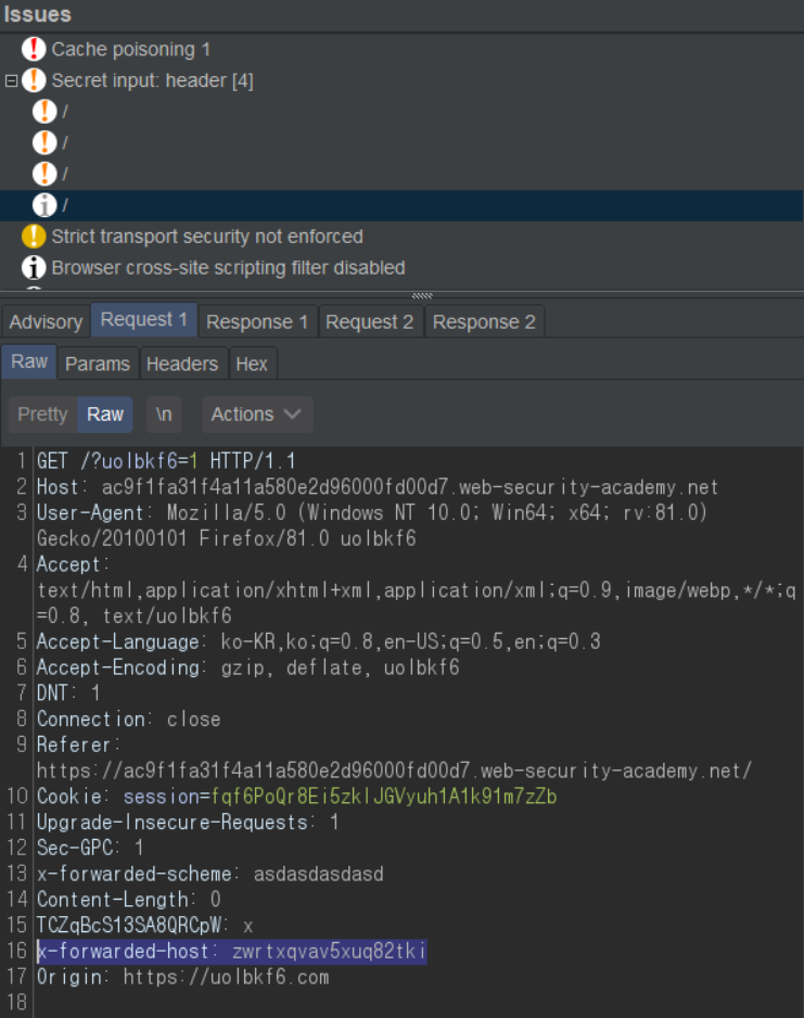 x-forwarded-scheme 헤더를 붙인 상태에서 다시 Param Miner로 헤더를 찾으면 함께 쓰이는 헤더를 찾을 수 있다. x-forwarded-host 헤더를 이용한다는 것을 찾아냈다. 또한 캐시 포이즈닝 취약점이 있다고 알려준다.