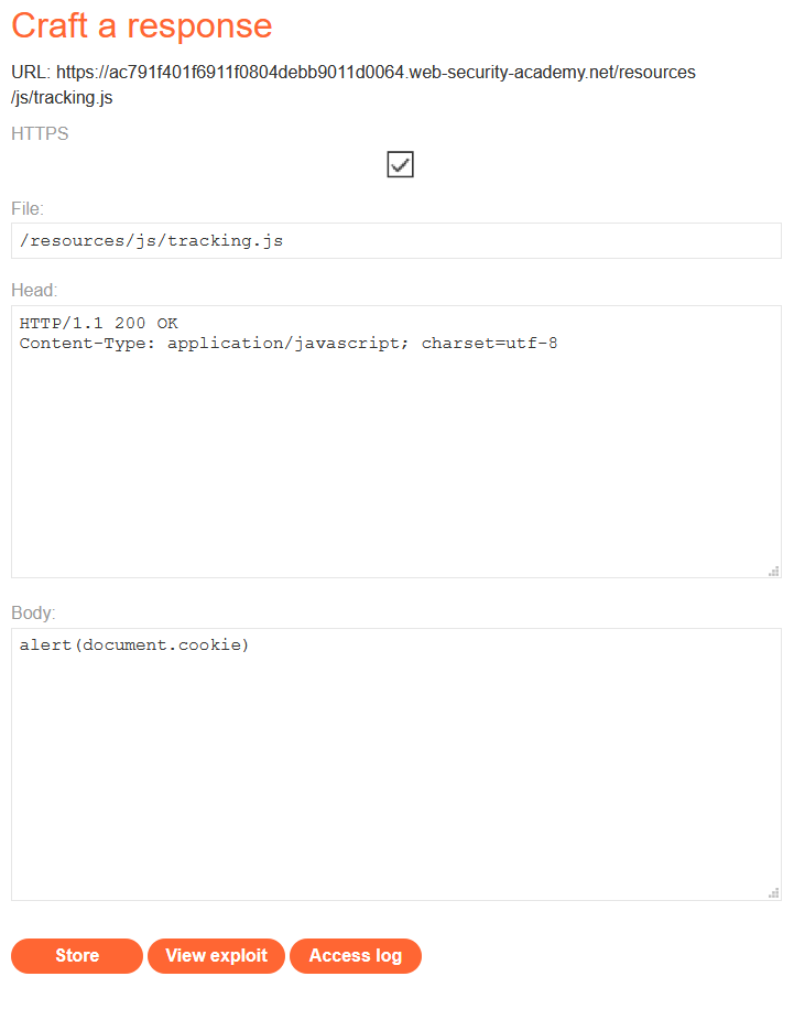 상단의 Go to exploit server 버튼을 누르면 공격자 HTTP 서버를 수정할 수 있다. 경로는 원 서버에서 참조하는 js 파일과 동일하게 한다.