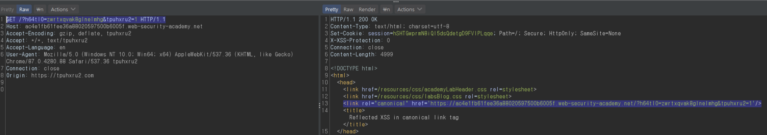 숨겨진 GET 파라미터가 있는지 Param Miner를 이용해 찾아본다. 특정 파라미터가 있지는 않지만, 파라미터를 포함한 URL이 그대로 반사되는 것을 발견했다. HTML head의 link에서 반사된다.