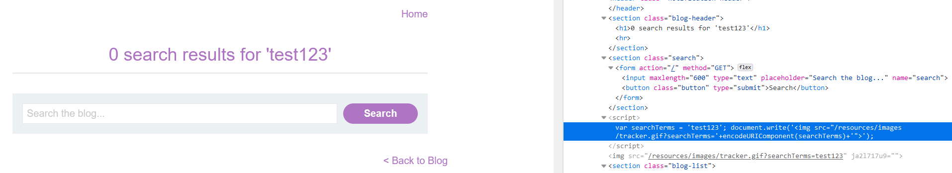 검색한 값은 h1 태그의 텍스트값으로 반사된다. 또한 script 태그로 감싸진 곳에 javascript 문자열로 하드코딩된다. 그리고 img 태그의 src 값에도 반사된다. img 태그는 이 javascript 코드를 통해 생성되었다. URL 인코딩되어 들어가므로 이 코드를 이용해 악의적인 img 태그를 생성하기는 어렵다.