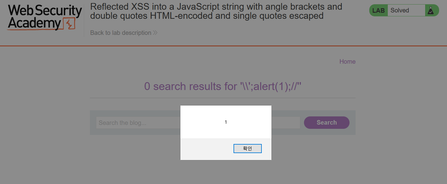 \';alert(1);// 로 백슬래시를 추가해 프로그램이 추가하는 백슬래시를 이스케이프하면 성공한다. 이 취약점은 사용자가 입력한 값을 충분히 검증하지 않고 반사하여 발생하였다. \ 문자는 이스케이프 했지만, 이스케이프에 사용되는 \\ 문자는 이스케이프하지 않아 문제가 발생했다.