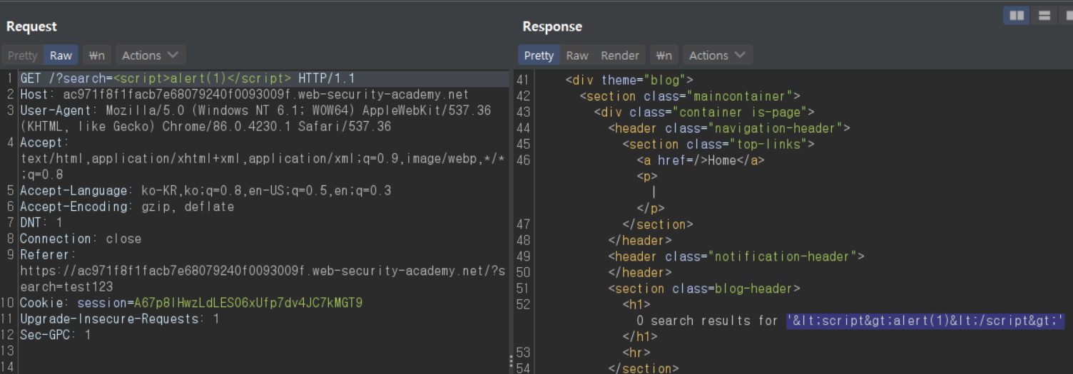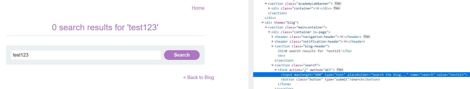 검색한 값은 h1 태그의 텍스트값으로 반사된다. 또한 검색란에 value에도 반사된다. 검색값은 search라는 이름의 URL 쿼리로 들어간다.