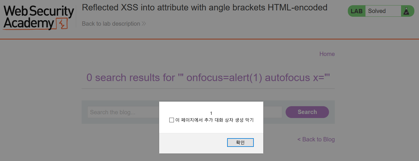 검색란의 value에서 반사되는 것을 이용해 XSS를 한다. " onfocus=alert(1) autofocus x=" 와 같은 페이로드를 이용한다. 입력란에 포커스가 잡히면 스크립트가 실행되는데, autofocus를 이용하여 자동으로 포커스가 잡히게 하여 트리거한다.