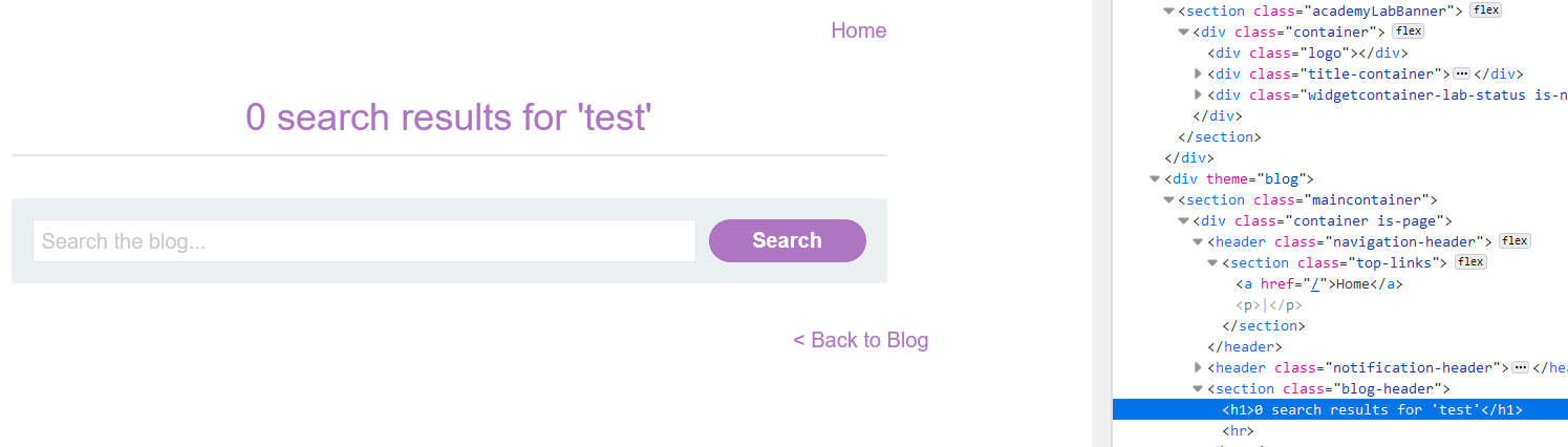검색한 값은 h1 태그의 텍스트값으로 반사된다. 검색값은 search라는 이름의 URL 쿼리로 들어간다.