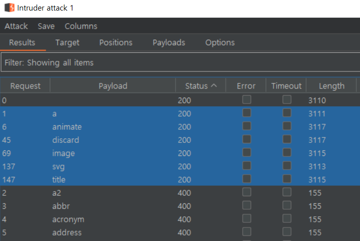 a, animate, discard, image, svg, title 태그가 우회 가능했다. 우회 가능한 태그별로 XSS에 쓸만한 속성이 있는지 찾아본다.