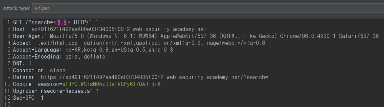 허용되는 태그를 찾기 위해 Intruder를 이용한다. XSS cheat sheet 에서 태그 목록을 복사할 수 있다.