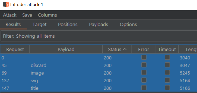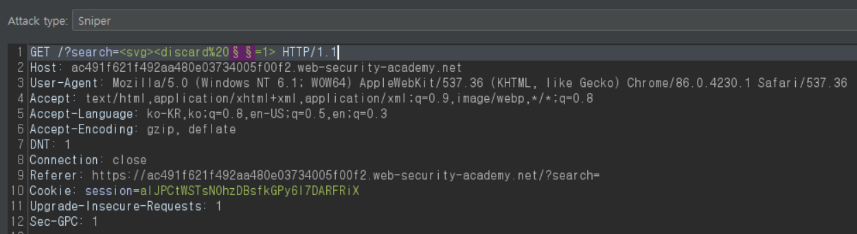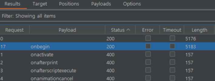 이번에는 discard 태그의 핸들러 중 사용 가능한 핸들러가 있는지 Intruder를 이용해 찾아본다. XSS cheat sheet 에서 핸들러 목록도 얻을 수 있다.