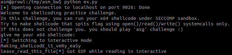 printf("Try to make shellcode that spits flag using open()/read()/write() systemcalls only.\n");