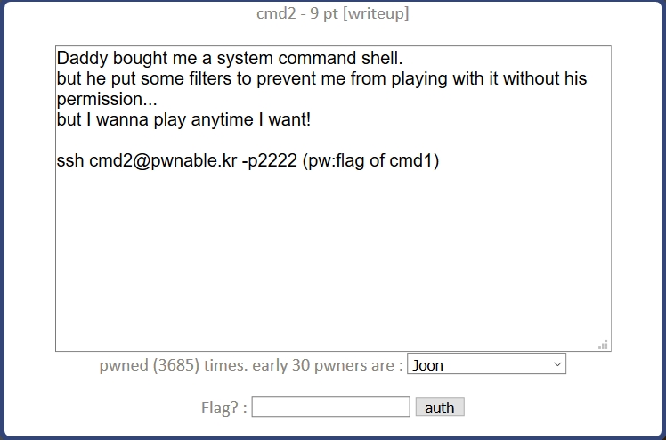 cmd1의 flag를 비밀번호로 이용해 접속한다. 문제는 다음과 같다.