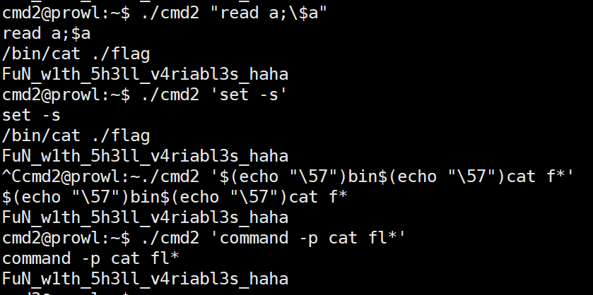 또다른 방법으로는 set 커맨드를 이용하여 환경변수를 설정할 수도 있다. ./cmd2 'set -s' 를 통해 환경변수를 다시 잡아주고, /bin/cat ./flag 를 입력하면 된다. 이는 sh에서만 가능하다. (bash 불가)