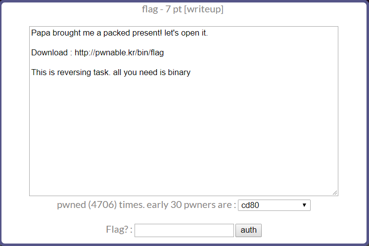 링크를 따라가면 ELF 실행 파일을 받을 수 있다. 이번 문제는 리버싱 문제이다.